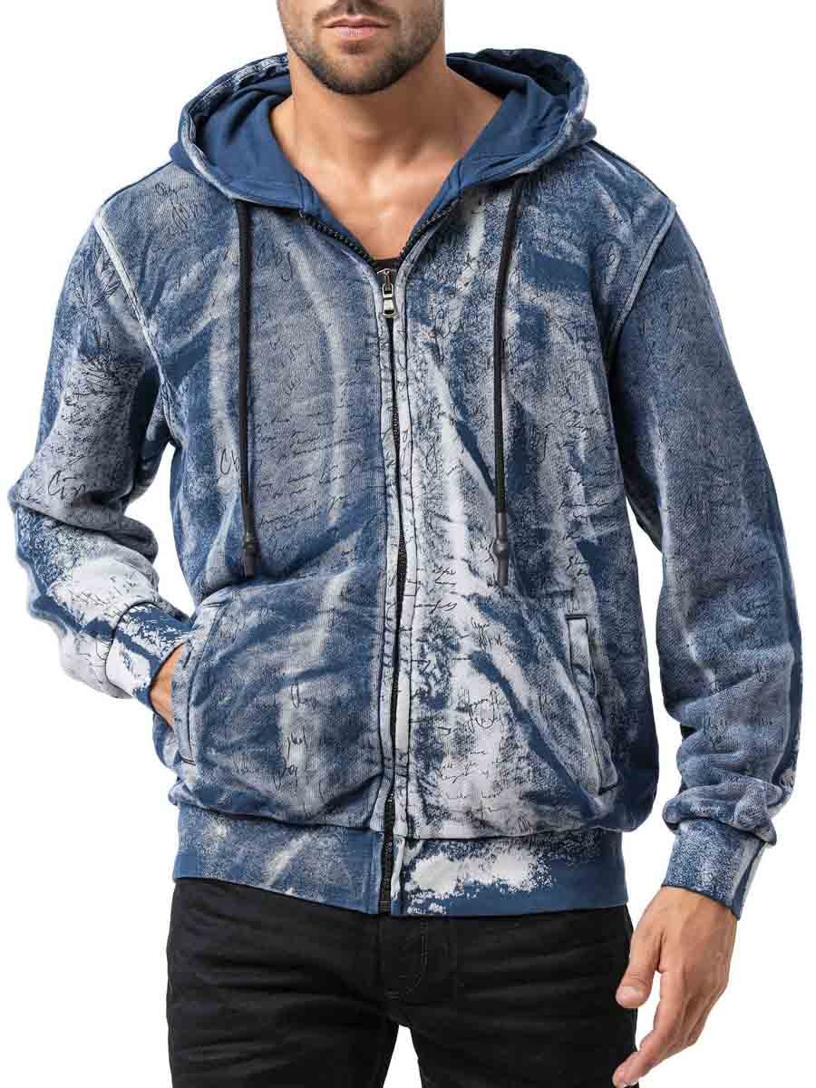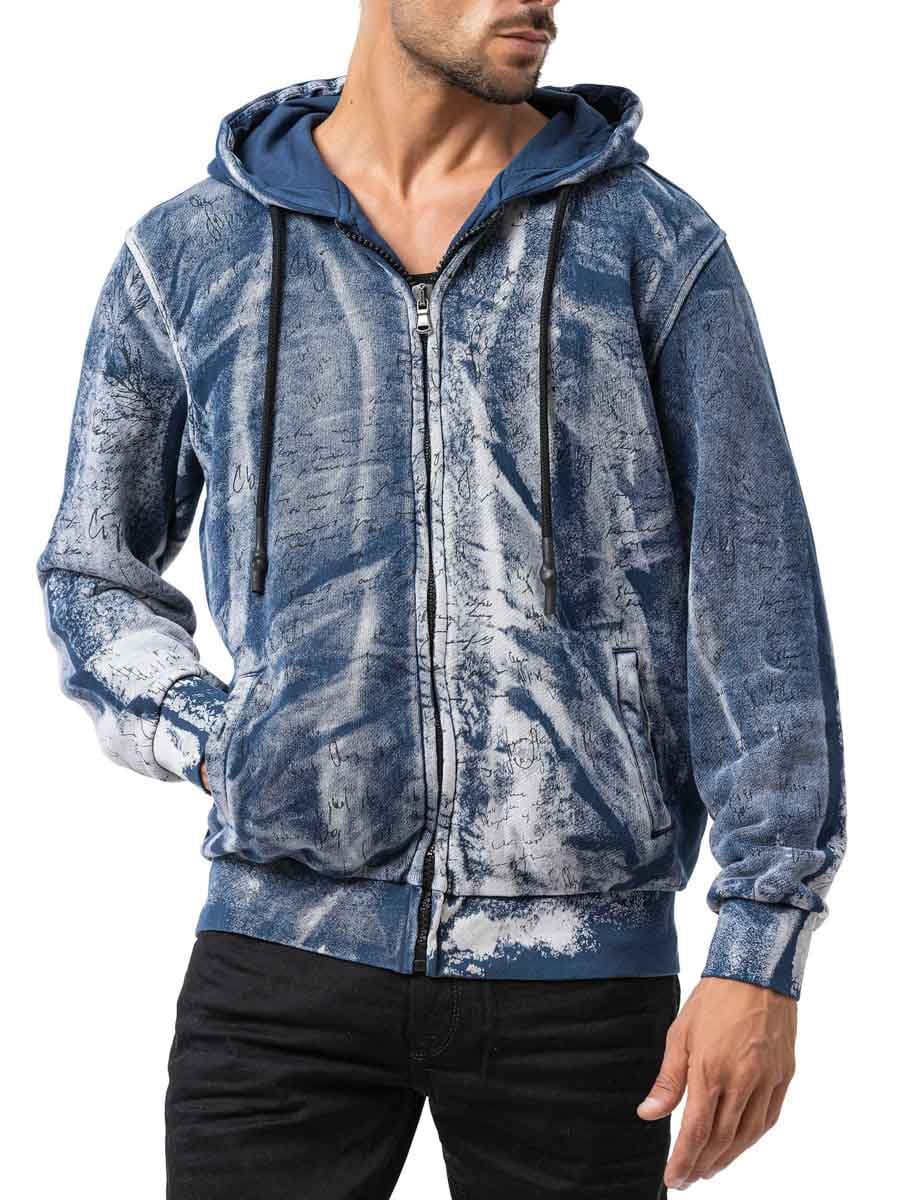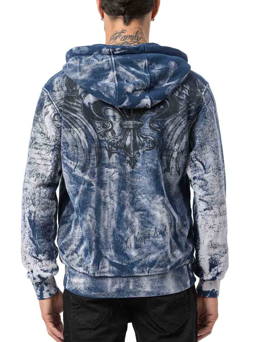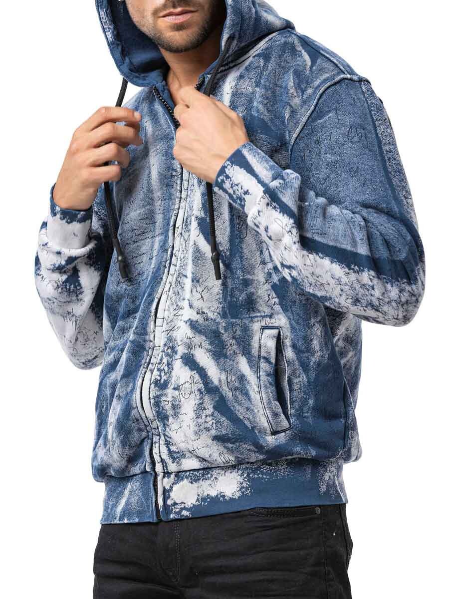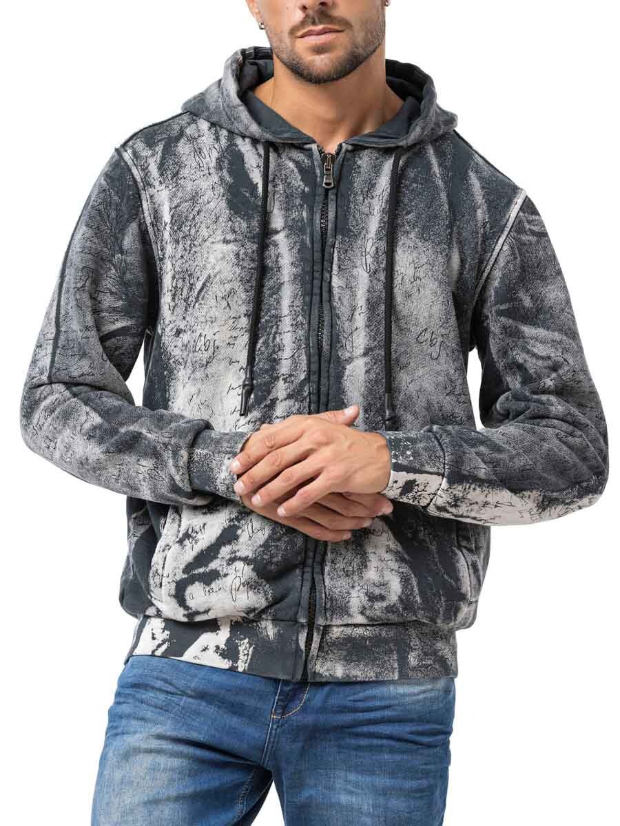 Mörk tröja med ljusare partier skapade genom ett tie-dye-inspirerat tvätt- och tryckmönster som ger plagget ett levande och något slitet uttryck. Det finns huva med snörning, två öppna fickor på magen och ribbad mudd i avsluten. Tillverkad i 100% bomull.