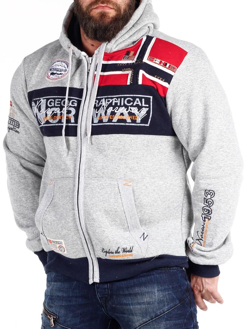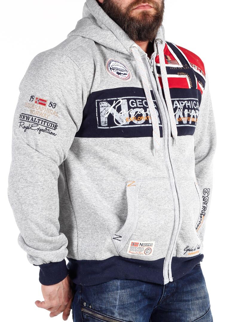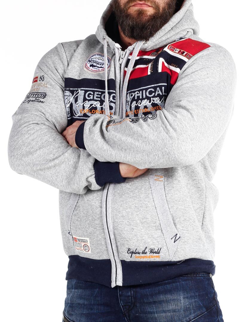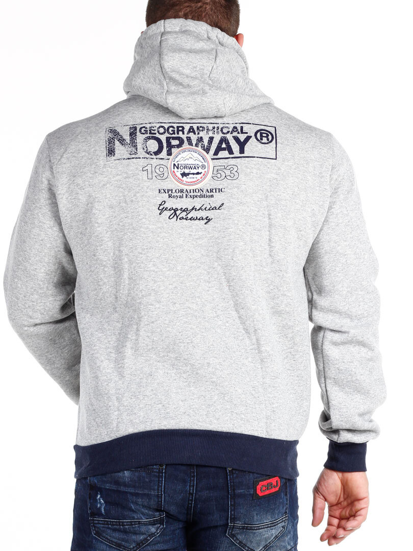 Tröja med rymlig huva, dragkedja som går hela vägen ner och stora fickor på magen. Märkets logga och mönster syns både fram och bak och den har blå mudd nertill, samt vid ärmsluten.