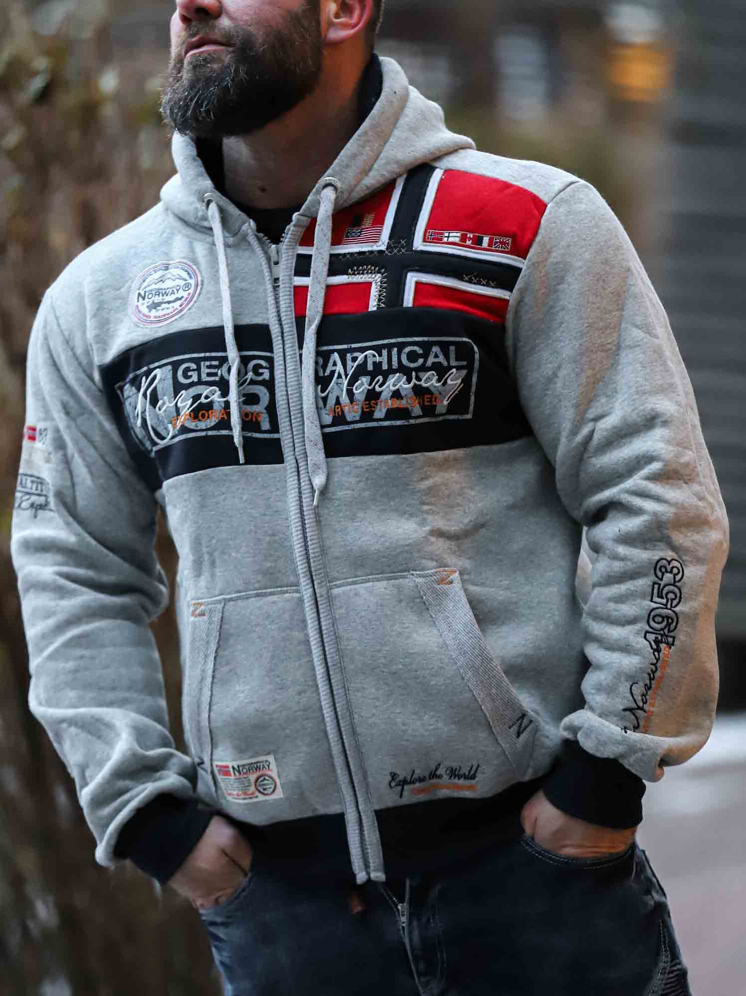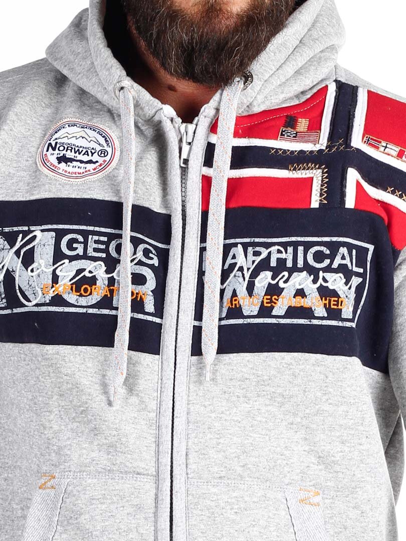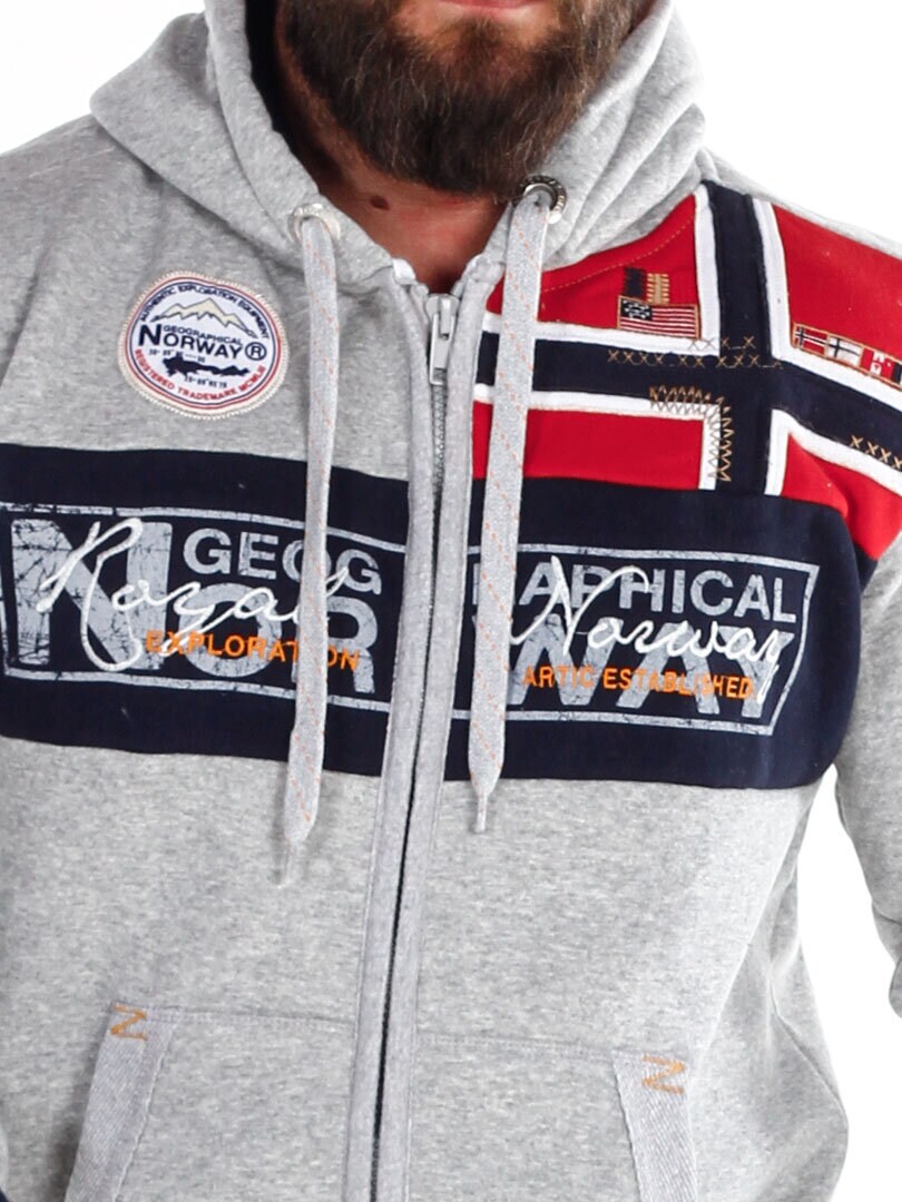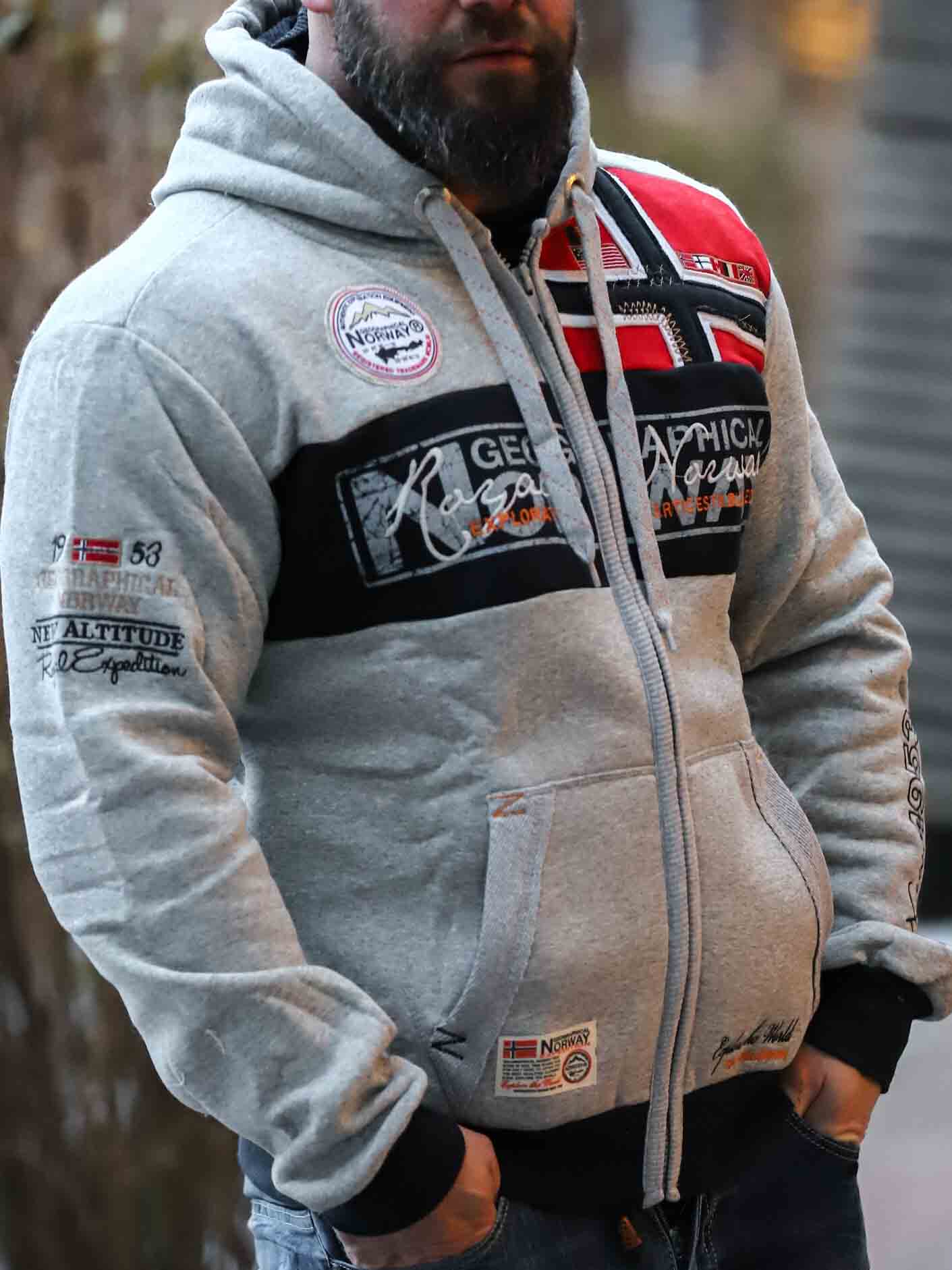Tröja med rymlig huva, dragkedja som går hela vägen ner och stora fickor på magen. Märkets logga och mönster syns både fram och bak och den har blå mudd nertill, samt vid ärmsluten.