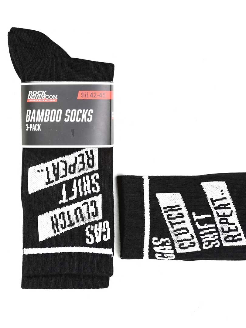 3-pack bambustrumpor i superkvalitet med texten "Gas, clutch, shift, repeat"