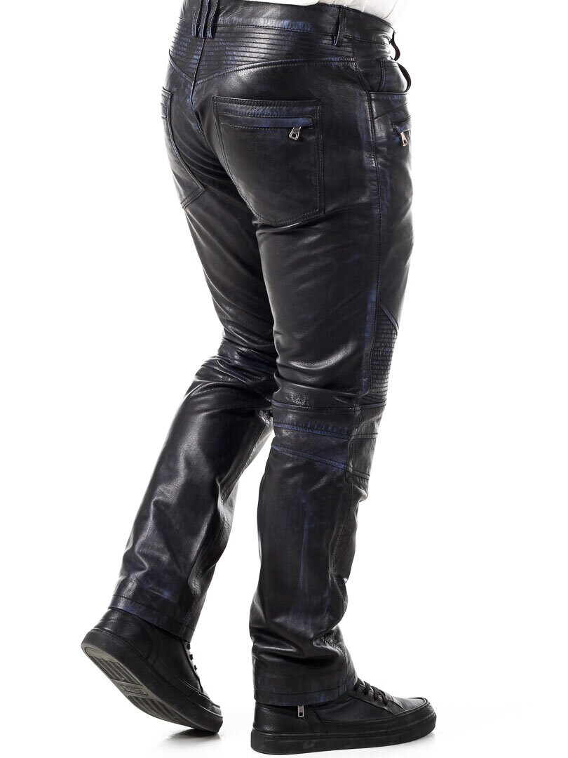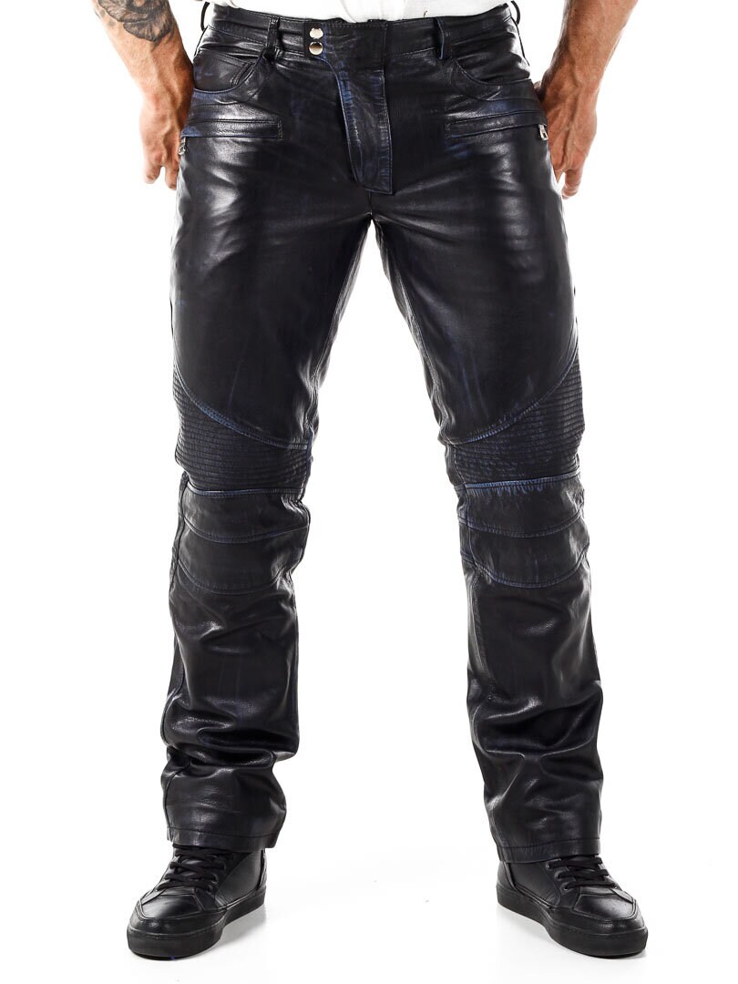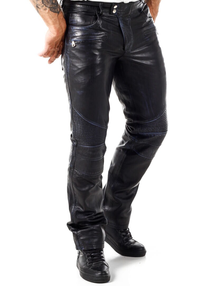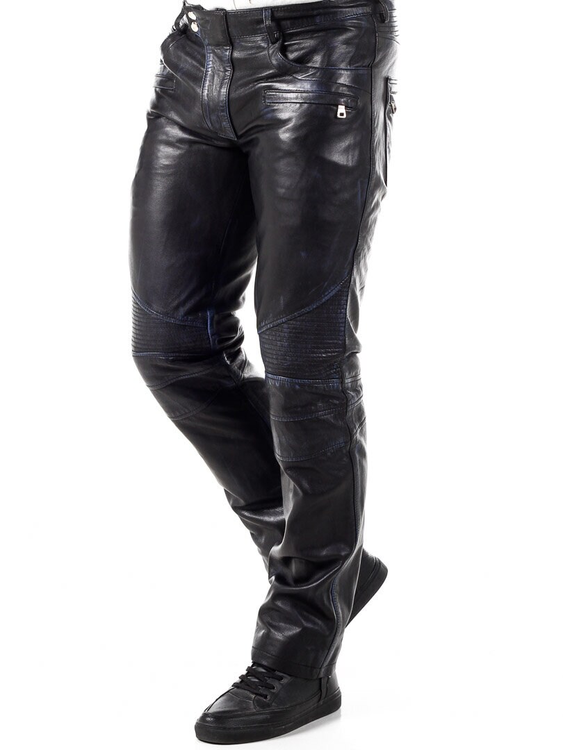 Svarta skinnbyxor med blåa inslag. De har flera fickor, både öppna och stängbara. Biker-inspirerad design med klassisk passform. Tillverkade i mjukt läder och finns endast hos Rockdenim!