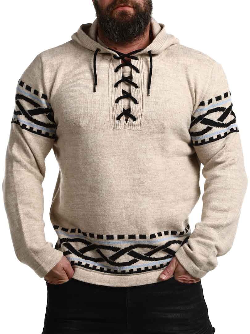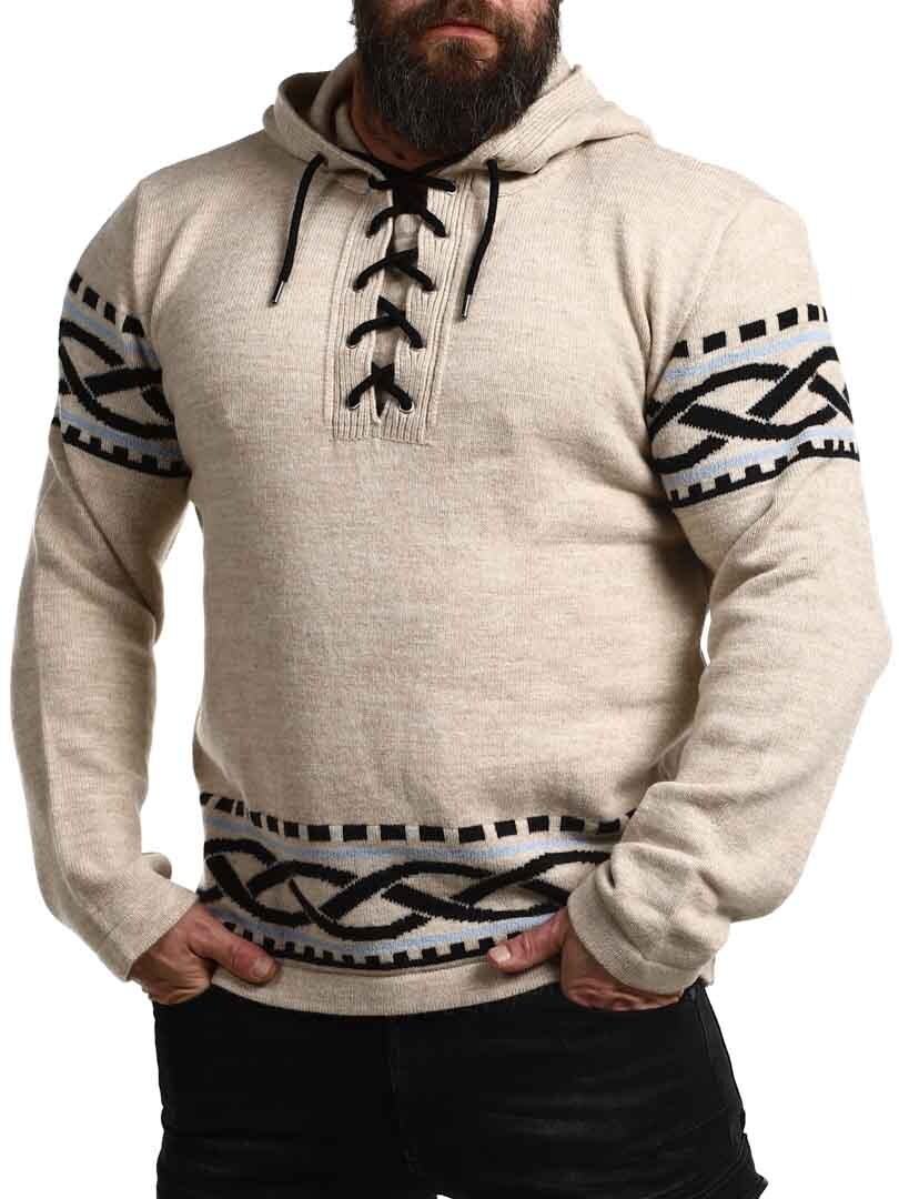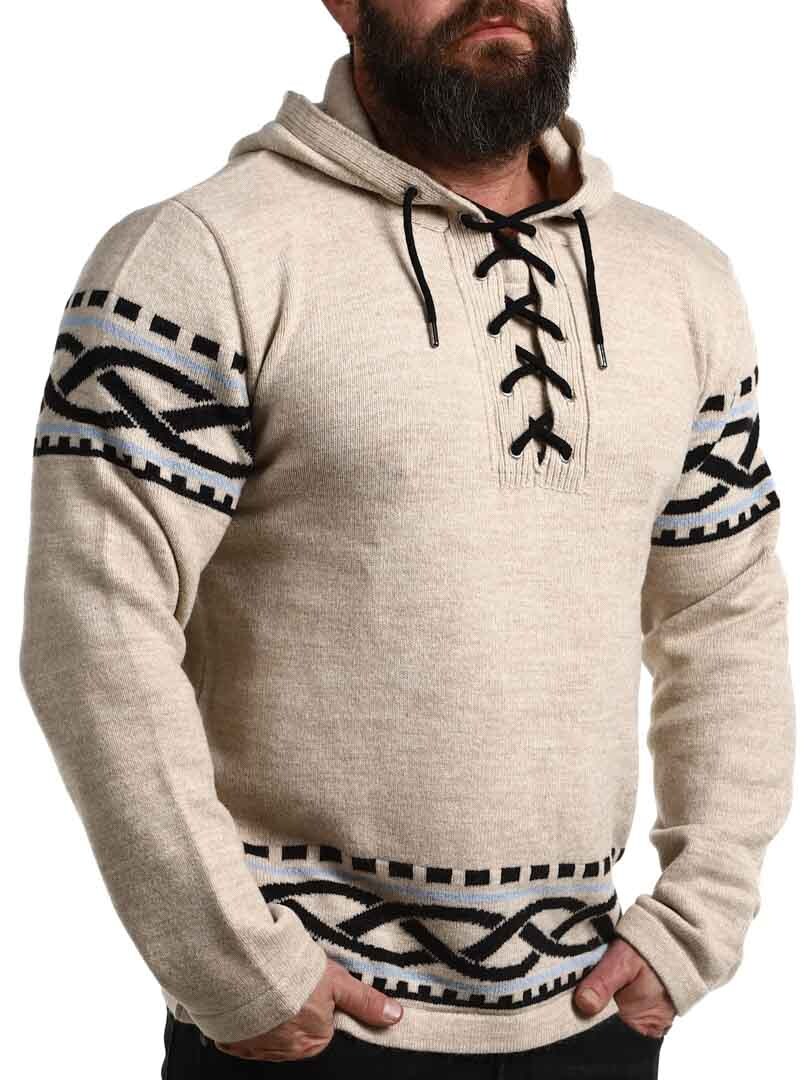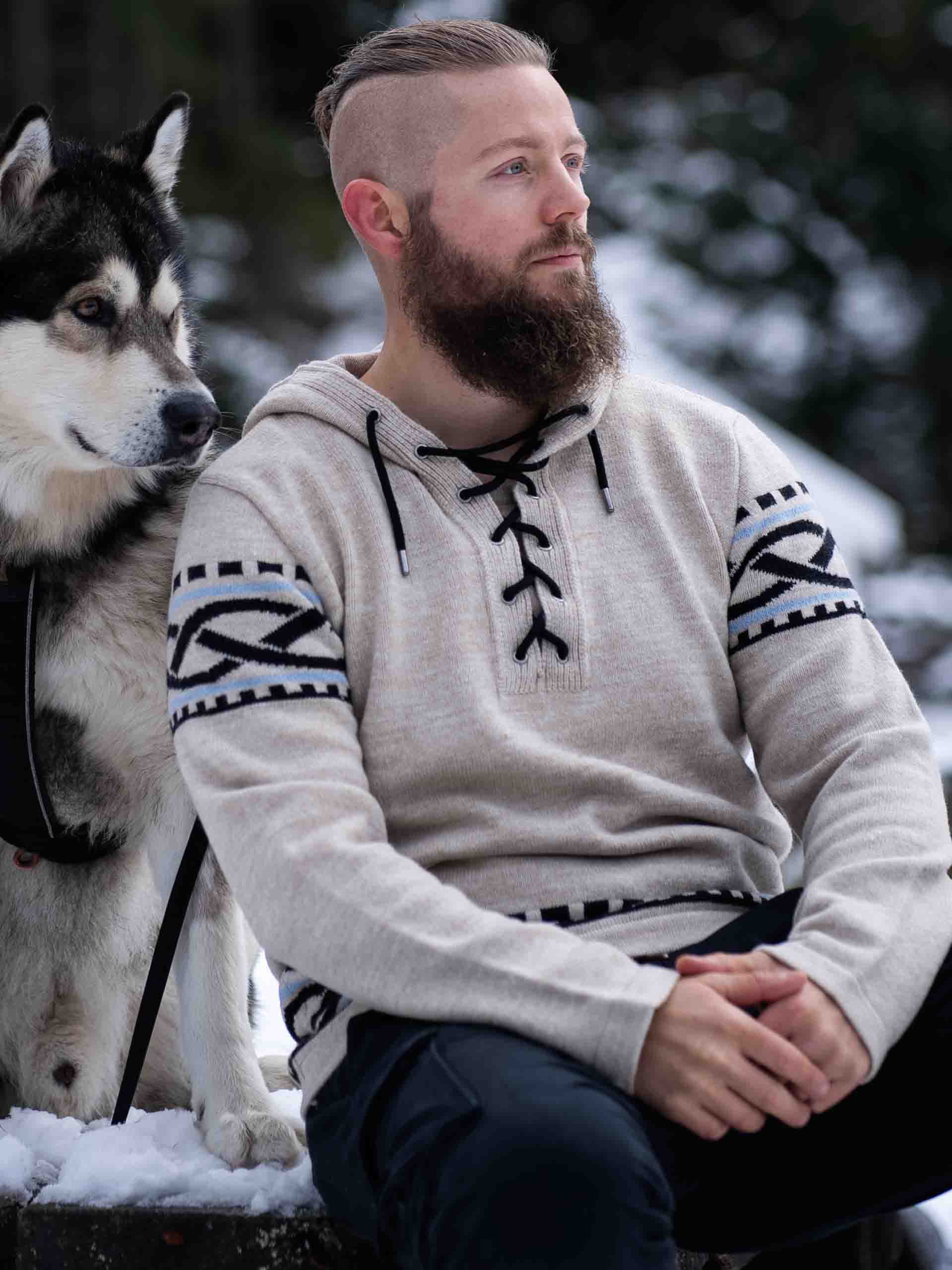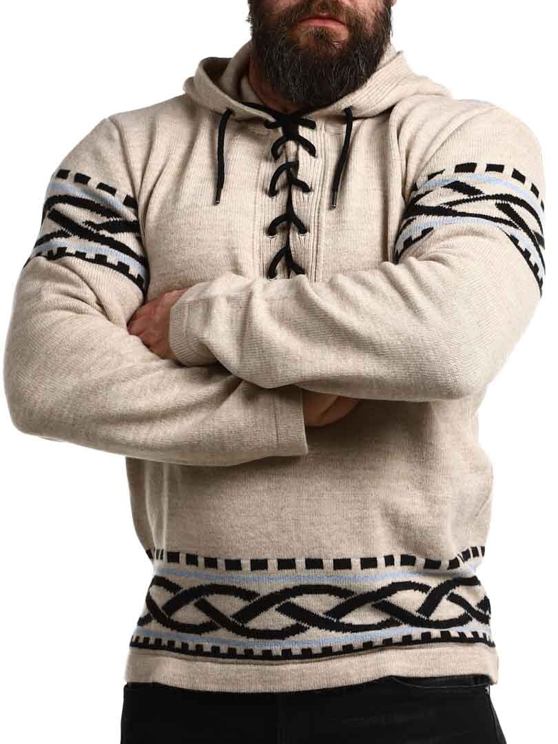 Känn kraften från norr med vår vikinginspirerade huvtröja – en perfekt kombination av rå stil och modern komfort. Tröjan har ett autentiskt nordiskt mönster med tydliga vikingadetaljer på ärmar och midja, samt snörning vid halsen som ger ett traditionellt och kraftfullt uttryck. Tillverkad i ett mjukt och varmt material som håller dig bekväm hela dagen – oavsett om du är ute i naturen eller vill sticka ut i vardagen.