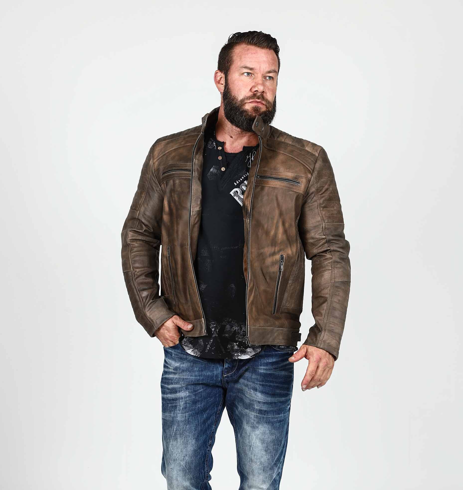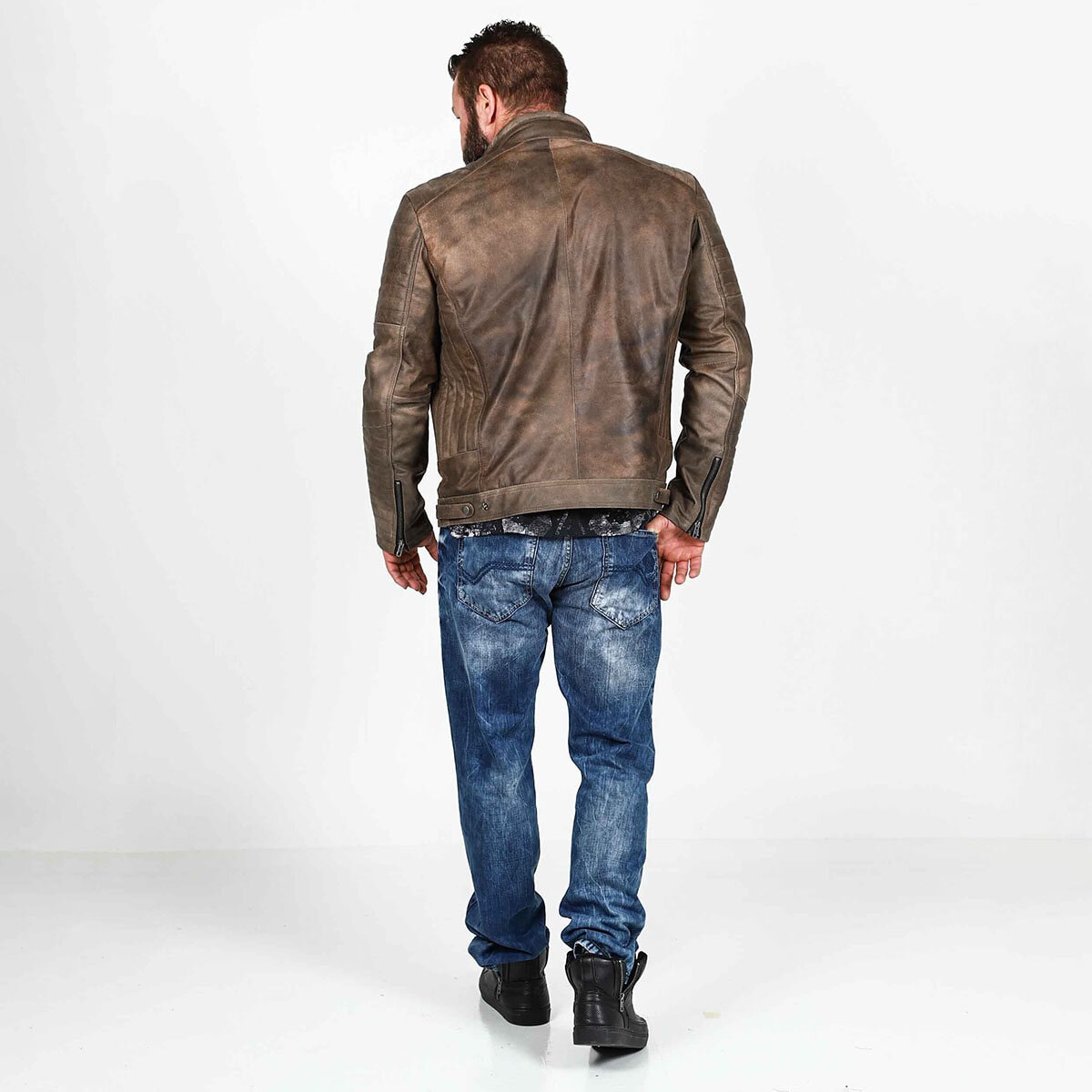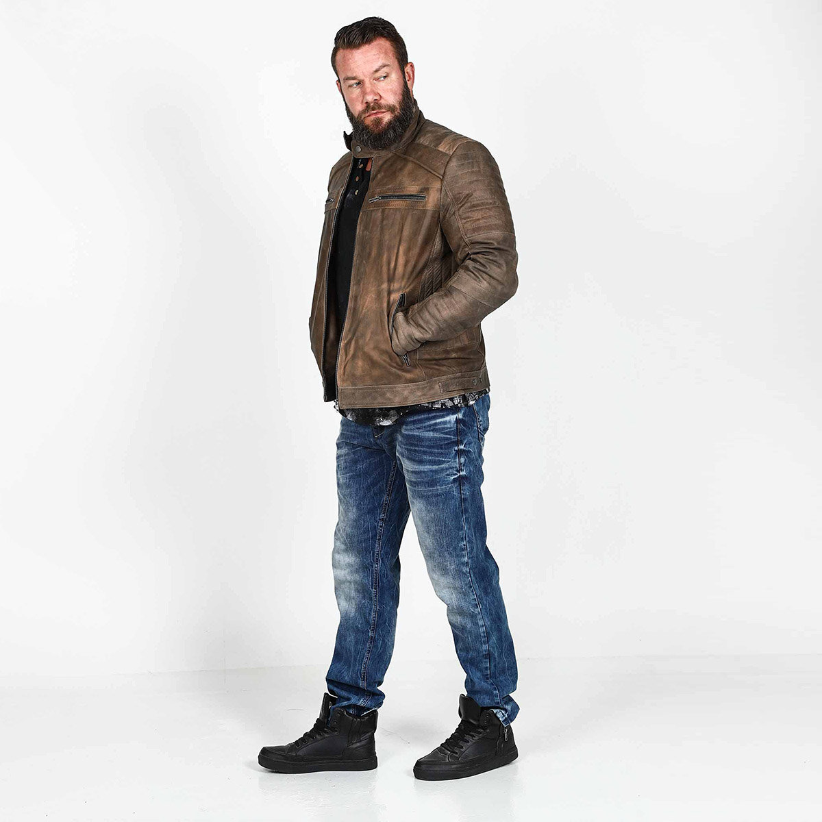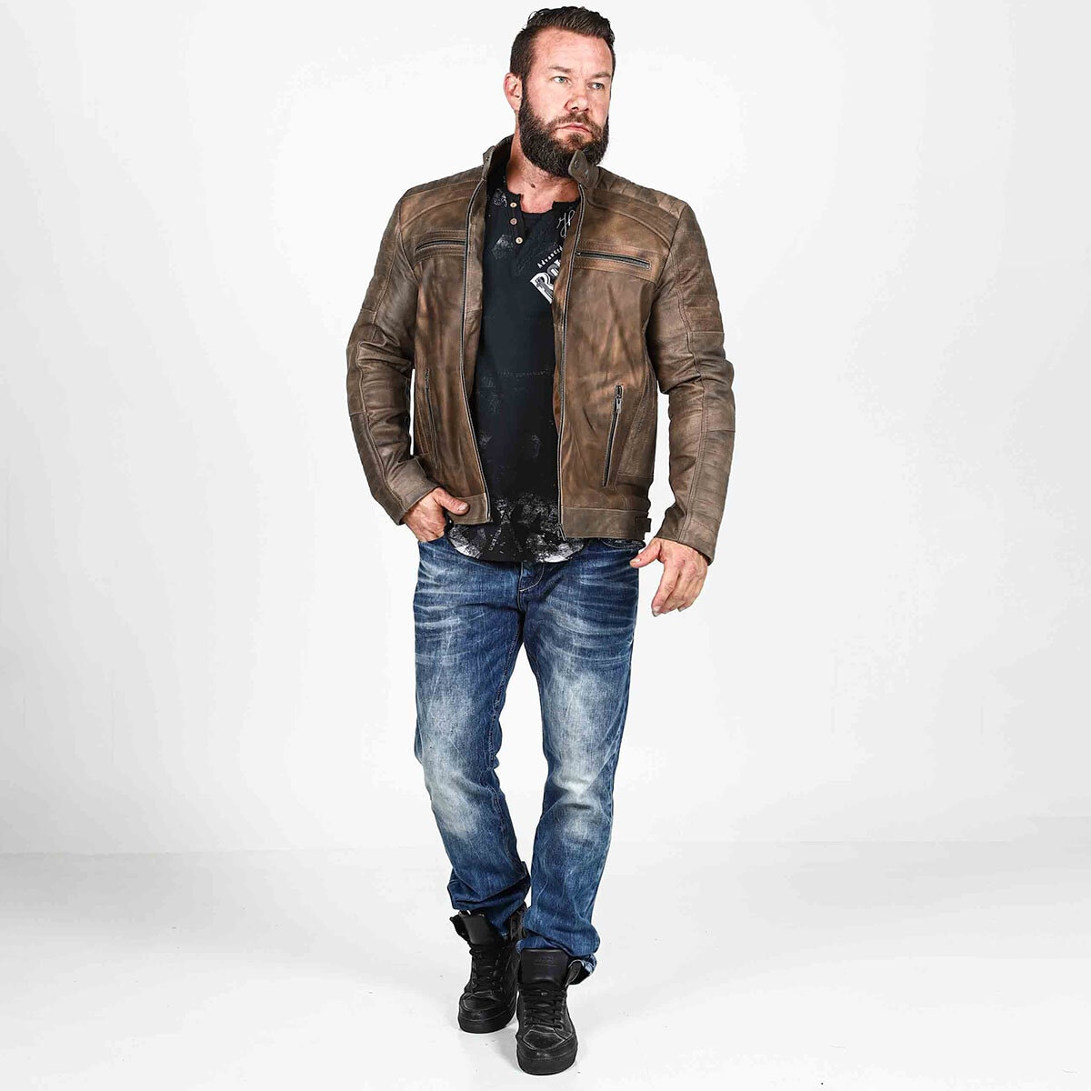 Letar du efter en stil som balanserar mellan avslappnat och uppklÀtt? Denna kombination Àr svaret. HÀr möter den klassiska biker-estetiken moderna, urbana detaljer. Det Àr en look för mannen som uppskattar kvalitet och vill ha klÀder som bara blir snyggare med Ären.