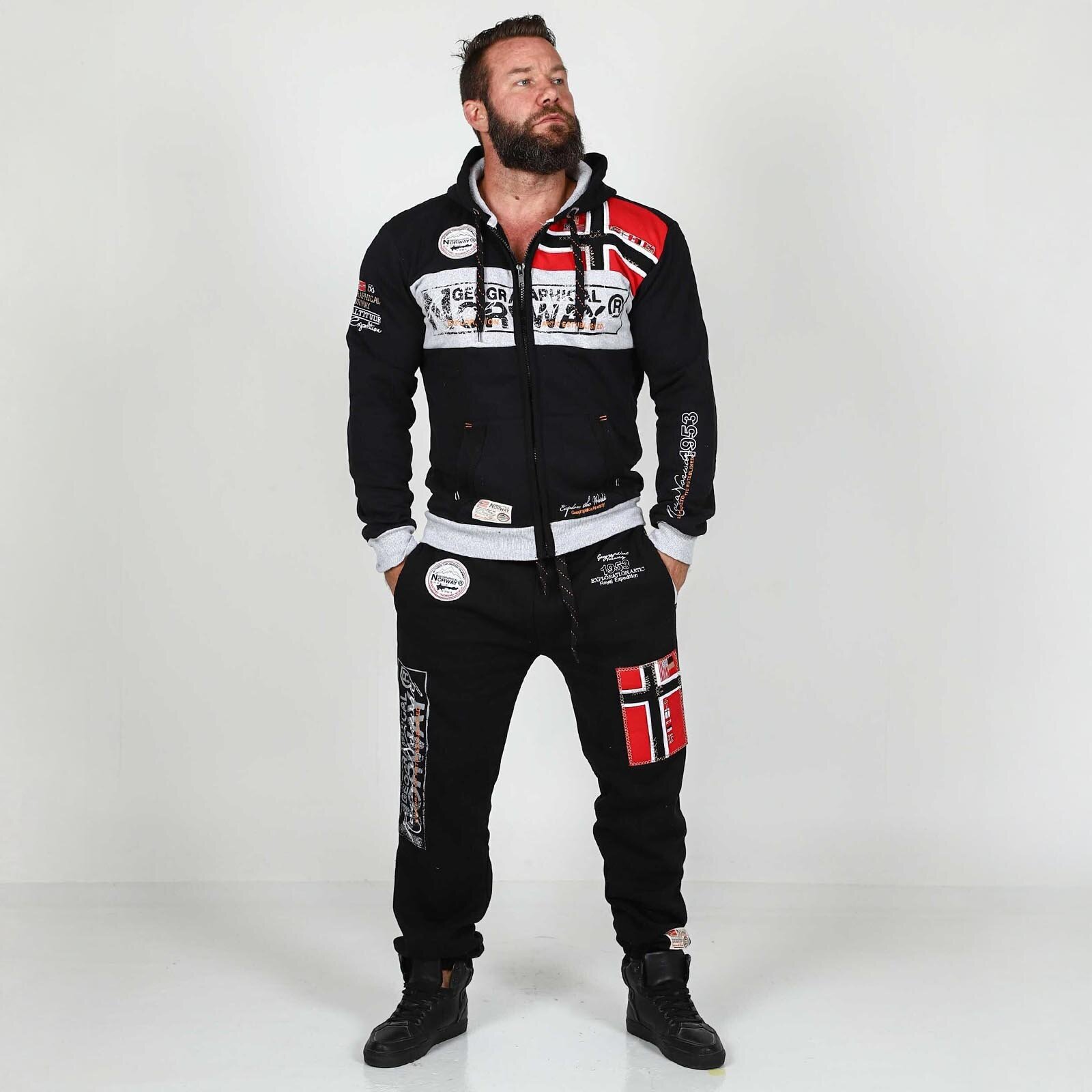 Skapa en enhetlig och bekväm stil med Geo Norway Hoodie - Svart. Kombinera den med de matchande mjukisbyxorna Geo Norway Sweatpants - Svart för en komplett look. Outfiten kännetecknas av ikoniska norska flaggor och djärva tryck som ger en sportig attityd till din vardag.